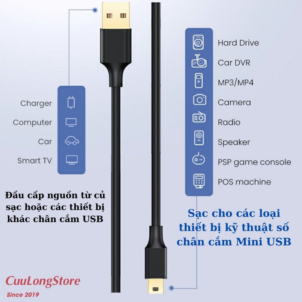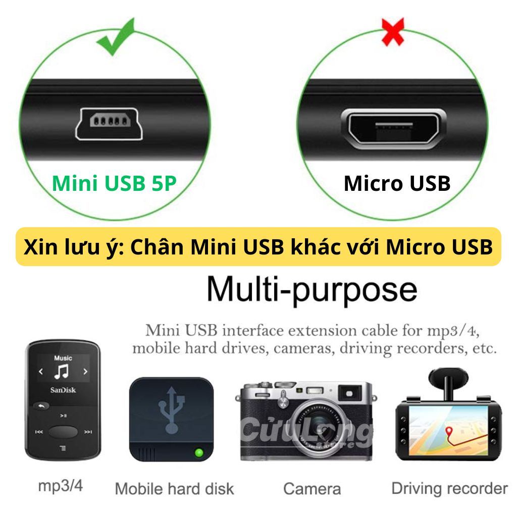 ✅ Mini USB 8P, Mini USB 5P (T-Type) dùng sạc cho máy ảnh, PSP, loa Bluetooth, máy nghe nhạc MP3/MP4, camera hành trình, ổ cứng di động.