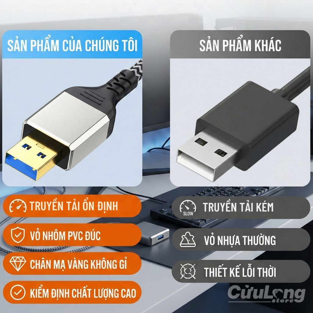 ✔️ Phiên bản: USB 3.0 (Truyền Dữ Liệu Nhanh). Lựa chọn tối ưu dành cho những ai cần truyền tải file nặng hoặc kết nối thiết bị ngoại vi yêu cầu tốc độ cao giúp tiết kiệm tối đa thời gian chờ đợi. Điểm vượt trội là đầu cắm được mạ vàng chống rỉ sét, tăng độ nhạy bén. Cấu tạo lõi siêu bền với đồng mạ thiếc gia cường, kết hợp lớp giấy nhôm và dây tiếp địa để đảm bảo tín hiệu luôn mượt mà, không nhiễu.